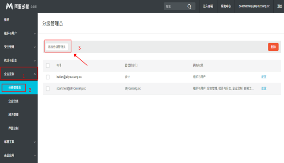 1. 登錄postmaster管理員后臺(tái)(分級(jí)管理員有且只有該管理賬號(hào)可以設(shè)置),選擇左側(cè)欄目安全管理》分級(jí)管理員,點(diǎn)擊添加分級(jí)管理員。