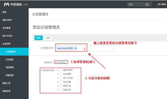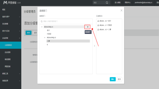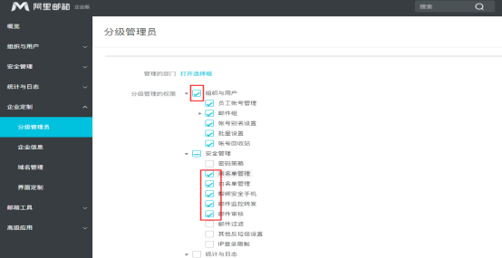 2. 設(shè)置分級(jí)管理員賬號(hào),選擇管理員的部門,分配權(quán)限