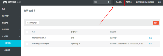 5. 注意事項(xiàng):被設(shè)置為分級(jí)管理員后,用戶登錄網(wǎng)頁(yè)端會(huì)先登入管理員后臺(tái)界面。需要使用用戶界面收發(fā)郵件可以點(diǎn)擊右上角<進(jìn)入郵箱>按鍵.